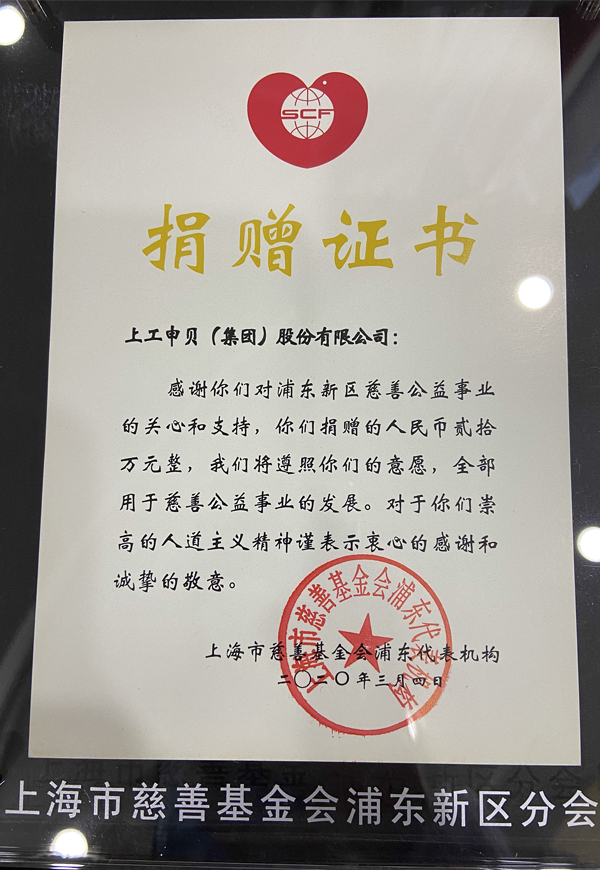 捐赠证书市慈善基金会浦东分会