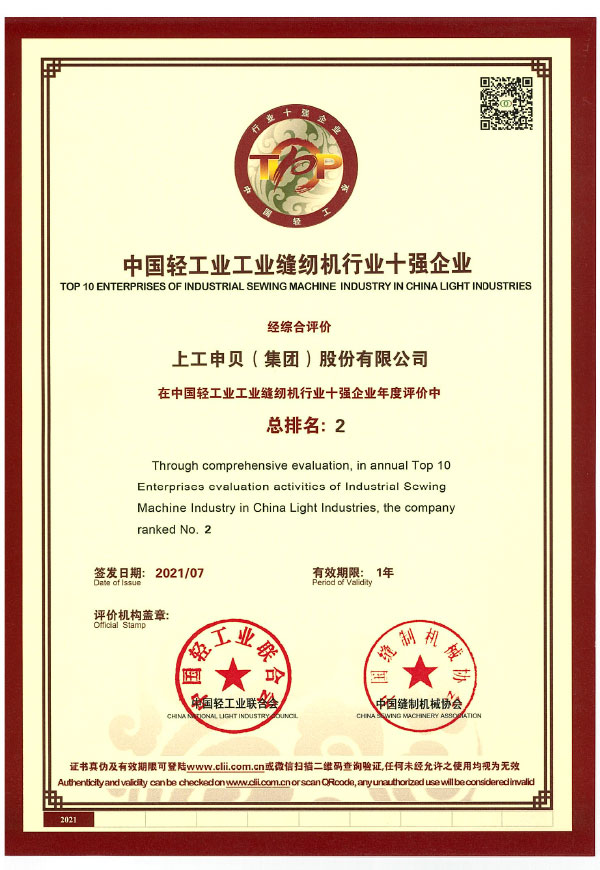 suncitygroup太阳集团(集团)股份有限公司入选中国轻工业工业缝纫机行业十强(第2名)